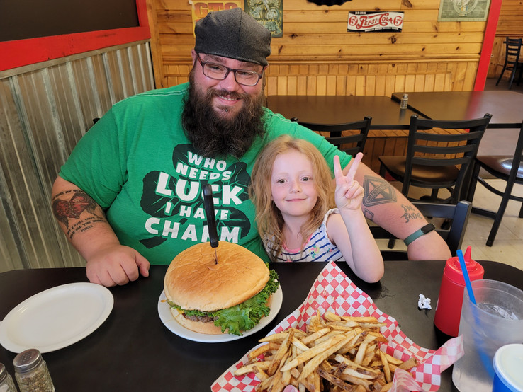 So Monday I called her and told her the trip was a no-go. She was bummed, but understood. In reality, I was plotting with Laura to pull off a surprise. Turns out she had Friday off. One last minute vacation request later, so did I. Love having PTO again! Friday morning I got up, showered and put on my kilt because it is so damn comfortable to travel in. If it was good enough for great grandpa to fight WWI in, it is good enough for a three and a half hour road trip. Responded to a few work emails, made a work call and sent some texts. Secured a new customer, then packed up the car. The three of us were off in the adventure vehicle of choice for us. A 2013 VW Beetle TDI might not exude manly energy, but at 40+ plus MPG on the highway, I truly do not give a shit what anyone thinks of it. We rolled into Archer, ID and headed for Big Juds. I promised Jackie a burger bigger than her head, and I delivered. The three of us split the Big Jud burger, and not a soul was left hungry. We then headed over to Saint Anthony, ID and stopped in at the Art Lab to surprise Dan and Kara. After checking out the Buffalo, we hit the road to check out the new rock shop located in the old Roxy theater. After showing Jackie two places in town that I lived, it was time to surprise Joy.